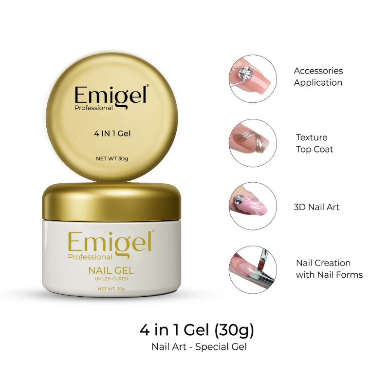 Emigel Professional 4 in 1 Nail Gel (30g) is a versatile nail art essential designed for professional and DIY use. This UV/LED cured gel works as a texture top coat, accessory adhesive, 3D nail art builder, and nail extension gel with forms. Its strong, flexible, and long-lasting formula ensures durability while maintaining a natural look. Perfect for creative nail designs, it offers endless possibilities in one powerful product.